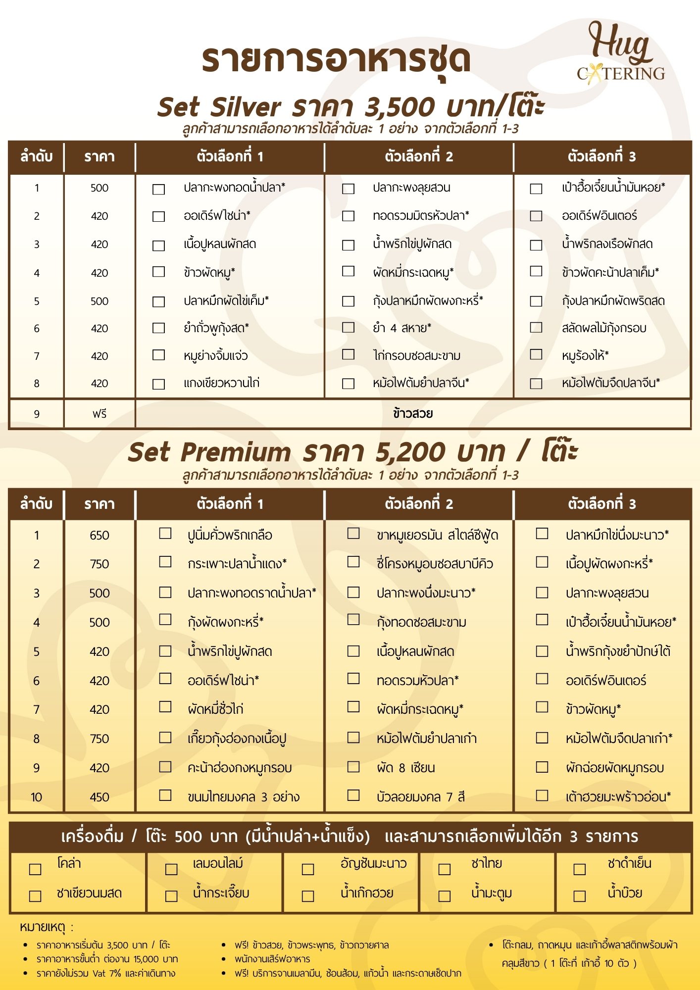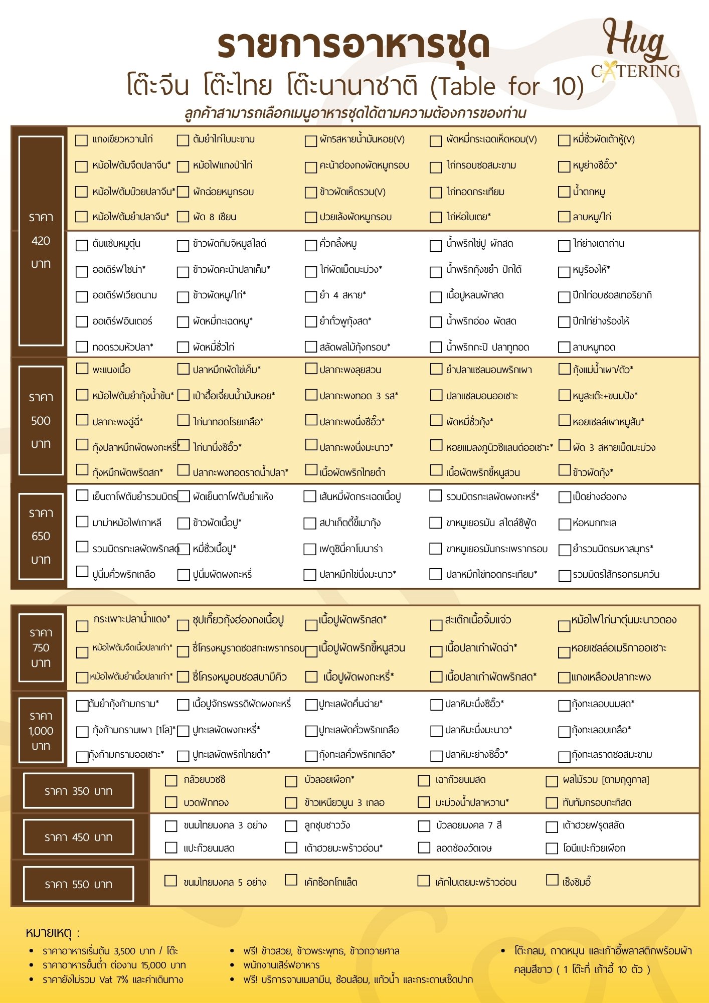 ฮัก แคทเทอริ่ง (Hug Catering) มีรูปแบบการจัดอาหารชุด (โต๊ะจีน) ที่หลากหลายและแตกต่างจาก จัดเลี้ยงนอกสถานที่อื่นๆ อาหารชุดของเรา เป็นในรูปแบบ ฟิวชั่น เก๋ๆ คัดสรรเลือกอาหารเอง (Mix and Match) ตามความต้องการและ งบประมาณของลูกค้า การจัดเลี้ยงนอกสถานที่ ของ Hug Catering สามารถเสิร์ฟ เป็นอาหารไทย ซีฟู้ด และ นานาชาติ ซึ่งอาหารชุด (โต๊ะจีน) ของเราเน้น ในเรื่อง คุณภาพสินค้าที่ดี รสชาติที่กลมกล่อม และ ภาพลักษณ์การจัดอาหารที่เก๋ไก๋ ให้เหมาะสม ดูดี ดูอบอุ่น เป็นกันเอง เป็นที่พึงพอใจและน่ายินดีสำหรับเจ้าภาพที่จัดงาน