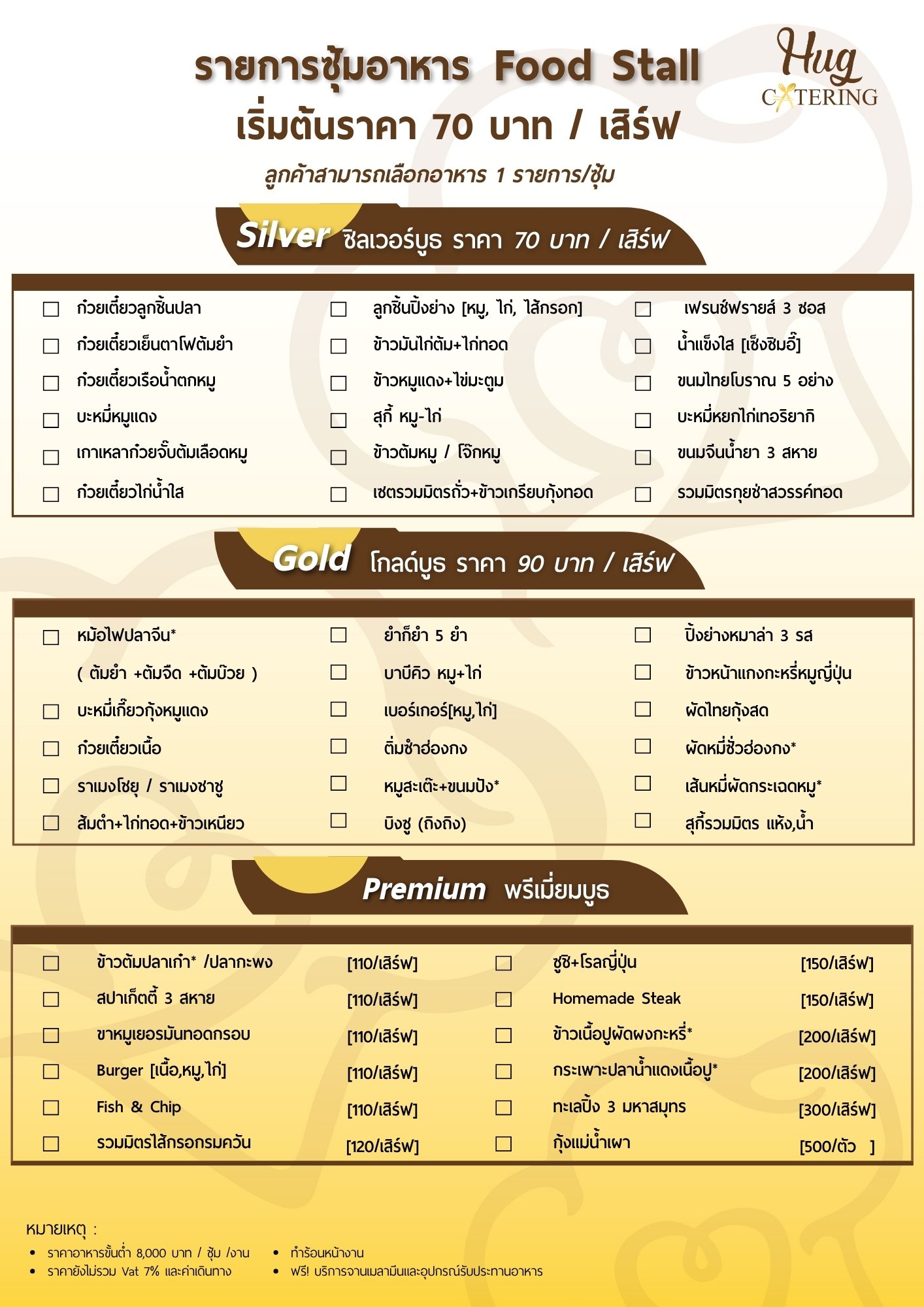 ฮัก แคทเทอริ่ง (Hug Catering) จัดเลี้ยงนอกสถานที่ อยากนำเสนอ ซุ้มอาหาร ซึ่งเป็นอีกรูปแบบในการ จัดงานเลี้ยง ลูกค้าสามารถเลือกรายการอาหาร ได้หลากหลาย ทั้ง อาหารไทย ซีฟู้ด ปิ้งย่าง อาหารจานเดียว อาหารนานาชาติ และ ขนมหวาน Hug Catering นำเสนอรายการกว่า 30 เมนู สำหรับซุ้มอาหาร จัดเลี้ยงนอกสถานที่ ทั้งนี้ ซุ้มอาหาร จัดงานเลี้ยง สามารถจัดได้ในทุกโอกาส อาทิ เช่น งานแต่งงาน งานเลี้ยงพนักงาน งานประชุมสัมมนา งานเลี้ยงสังสรรค์ งานประจำปี และงานการกุศล ซึ่งทุกรายการเมนู เราปรุงและเสิร์ฟร้อนๆ ทุกจาน