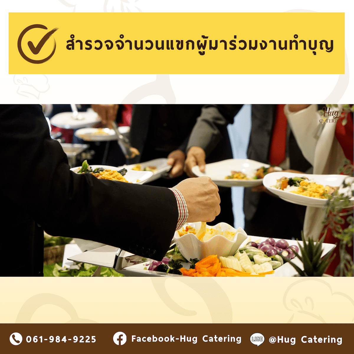 ก่อนสั่งอาหารบุฟเฟต์ ให้สำรวจและระบุจำนวนแขกที่จะมาให้ชัดเจน โดยการส่งบัตรเชิญและขอให้ตอบรับกลับมาภายในกำหนด หากยังไม่ได้รับการตอบรับจากบางท่าน ให้โทรสอบถามอีกครั้ง พอได้ยอดแน่นอนแล้ว ให้เผื่อเพิ่มอีกราว 5-10% เพื่อรองรับแขกที่อาจมาเพิ่มเติม จากนั้นนำยอดแขกไปคำนวณปริมาณอาหารที่ต้องสั่ง